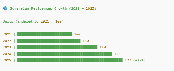 Since 2021, “sovereign residences” self‑contained ultra‑luxury estates have surged about 27% globally, signalling a notable shift toward private residential sovereignty.