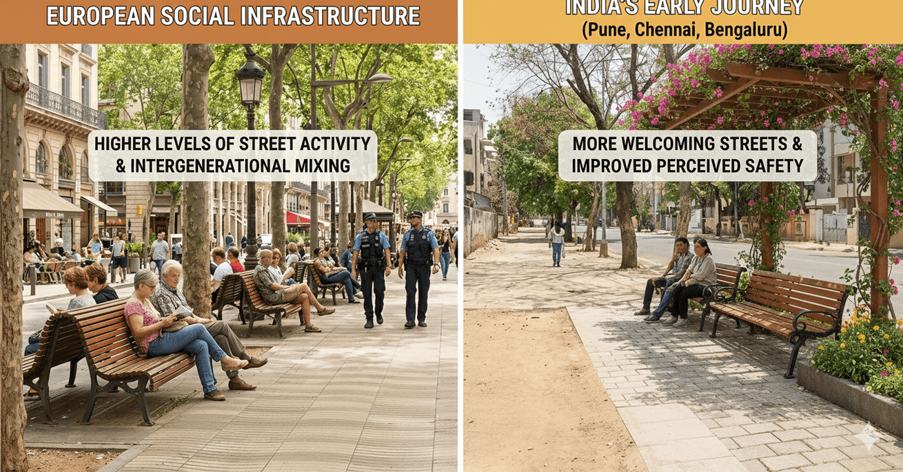 In India, we’re still early in this journey, but there are promising signs. Experimental work in cities like Pune, Chennai, and sections of Bengaluru’s CBD has shown that even small, thoughtful interventions - one shaded bench, a cluster of seating near a bus stop, a rest spot under a tree - can dramatically change how streets feel. People slow down. Families linger. Workers take brief, humane pauses. The street begins to belong to everyone, not just those passing through.