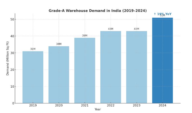 Grade-A warehouse demand in India hit 51 million sq ft in 2024 — a 19% growth YoY.